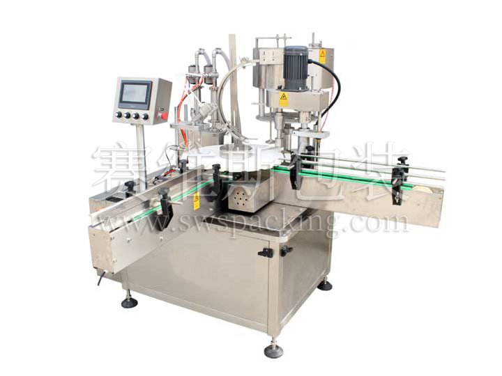 産品概述:産品概要:該機灌裝部分採用伺服電機驅動、容積式計量充填原理,實現瞭灌裝劑量的高精度。旋蓋部分由供蓋系統、刮蓋、壓蓋、夾緊、輸瓶和旋蓋等完成自動旋蓋。整機具有運行穩定可靠、生産效率高、适應性強的特點。主要參數:灌裝容量: 50ml~1000ml适用瓶徑: Ф40mm~Ф100…
